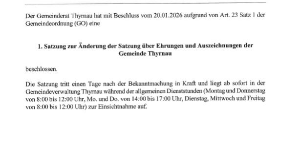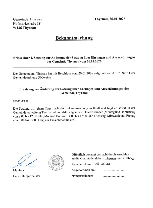 Bekanntmachung Erlass einer 1. Satzung zur Änderung der Satzung über Ehrungen und Auszeichnungen der Gemeinde Thyrnau vom 26.01.2026